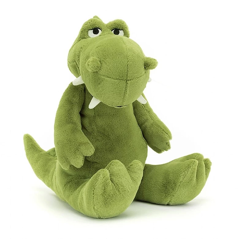 Take a seat next to Bryno Dino and watch the world go by. This apple-green dino is bold and eccentric, with a bobbly brow, knobbled nostrils, suedette tusks and huge squashy feet, not to mention that wedge tail embroidered with spines.